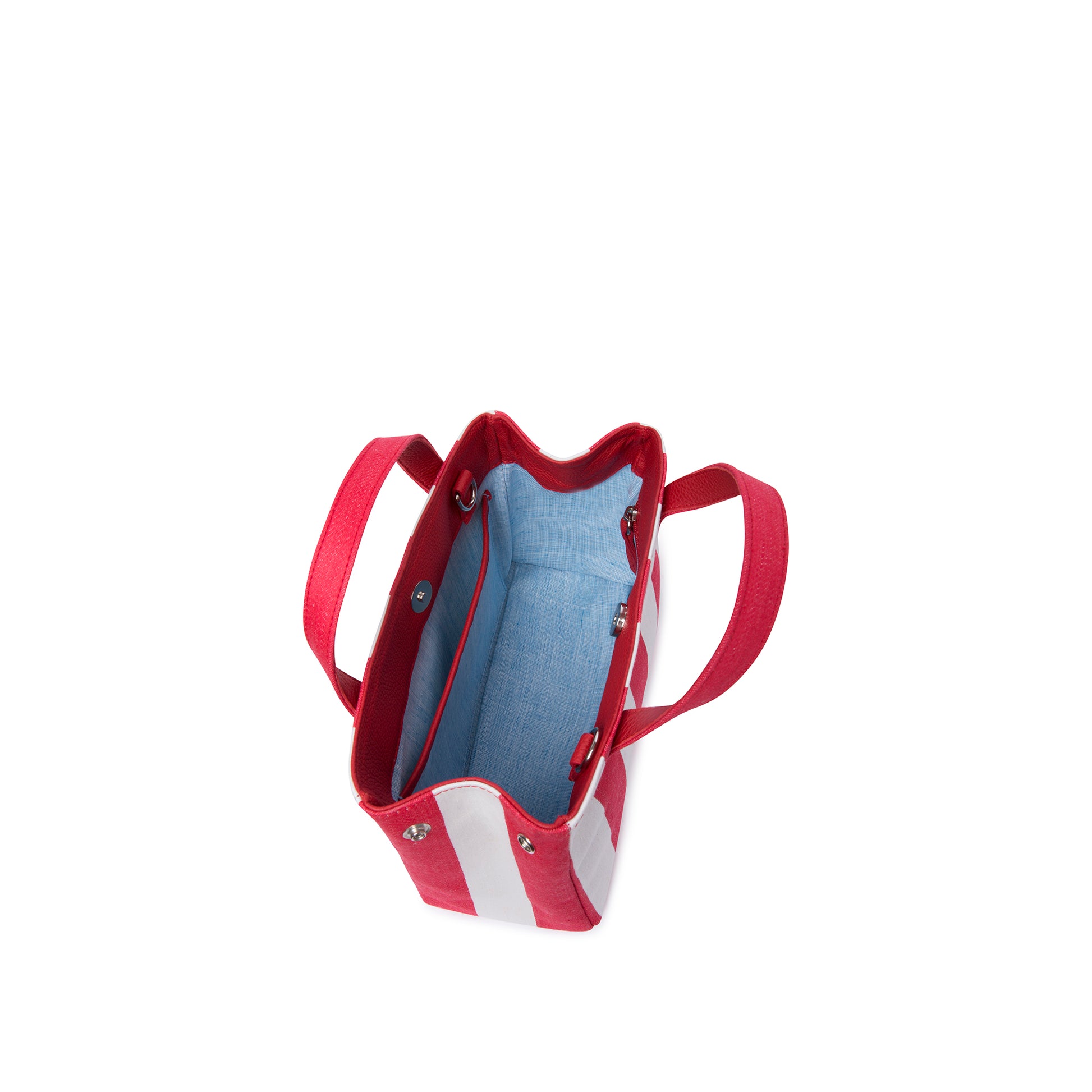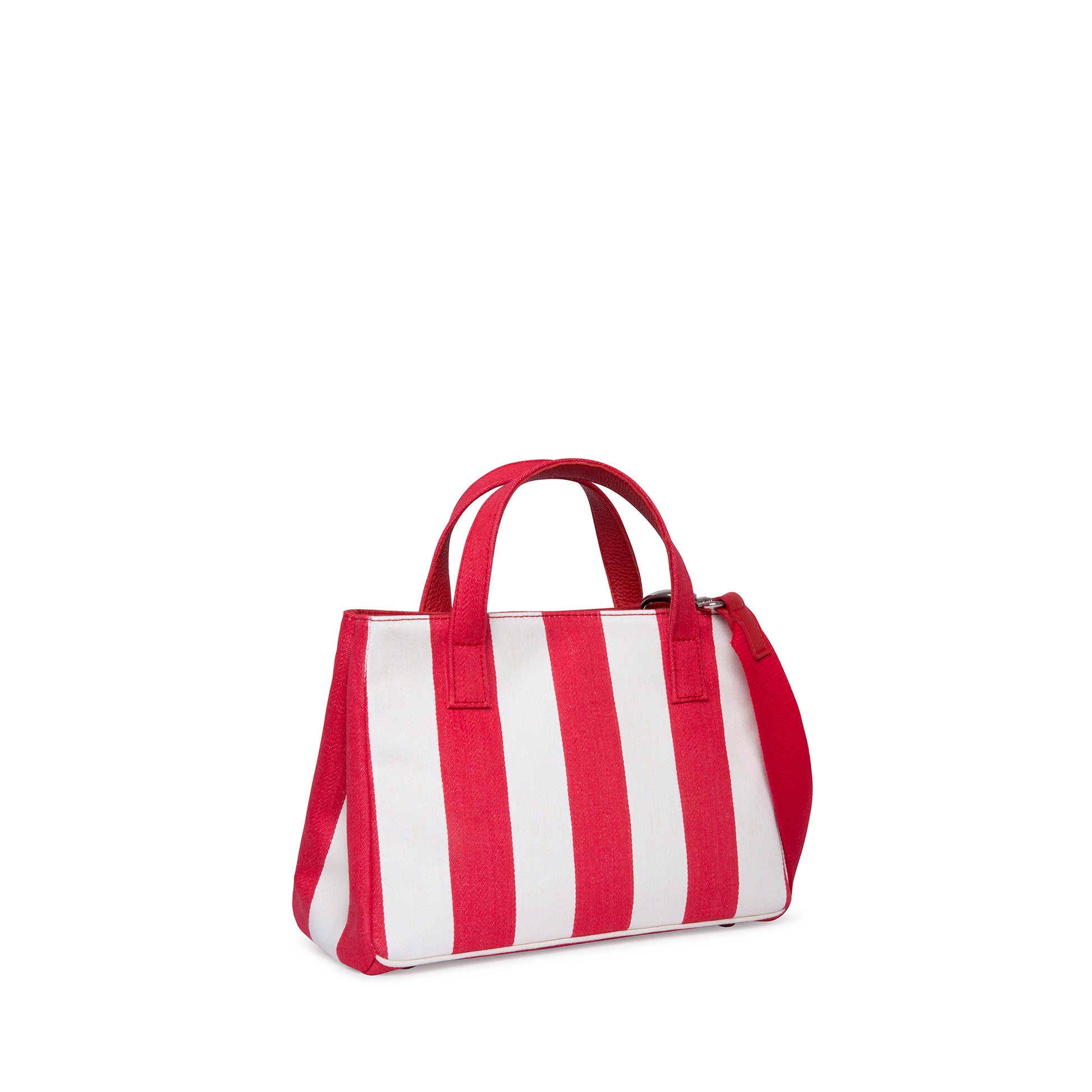 Bag with double handle and a long removable strap. Vintage cotton striped bag in red and white.
