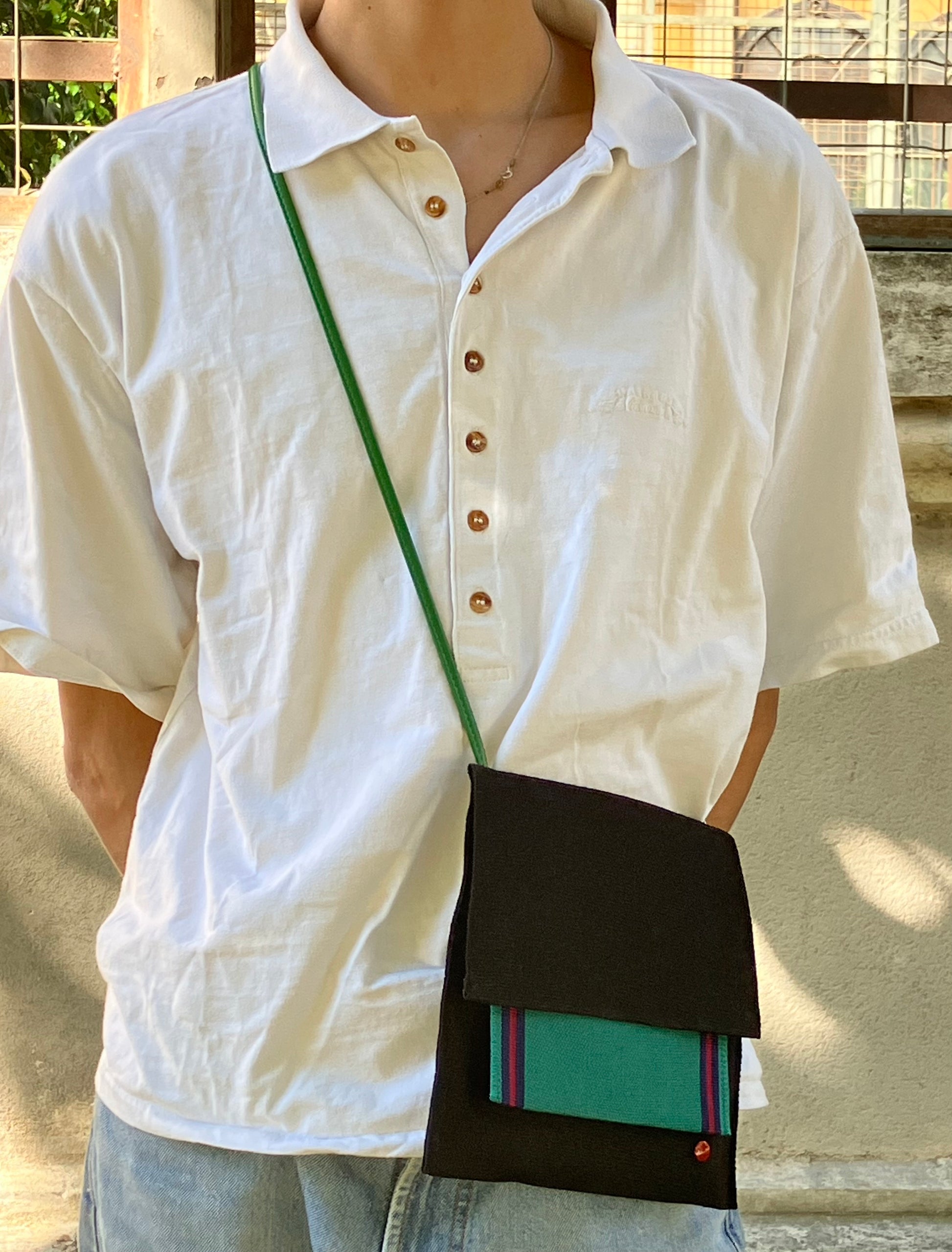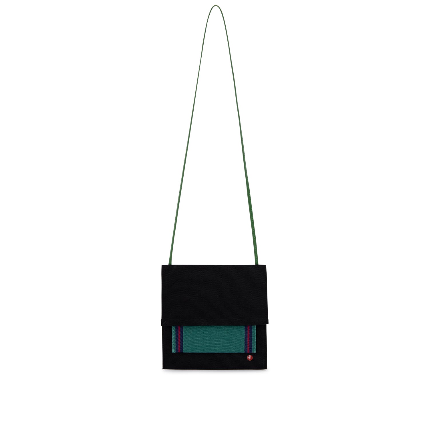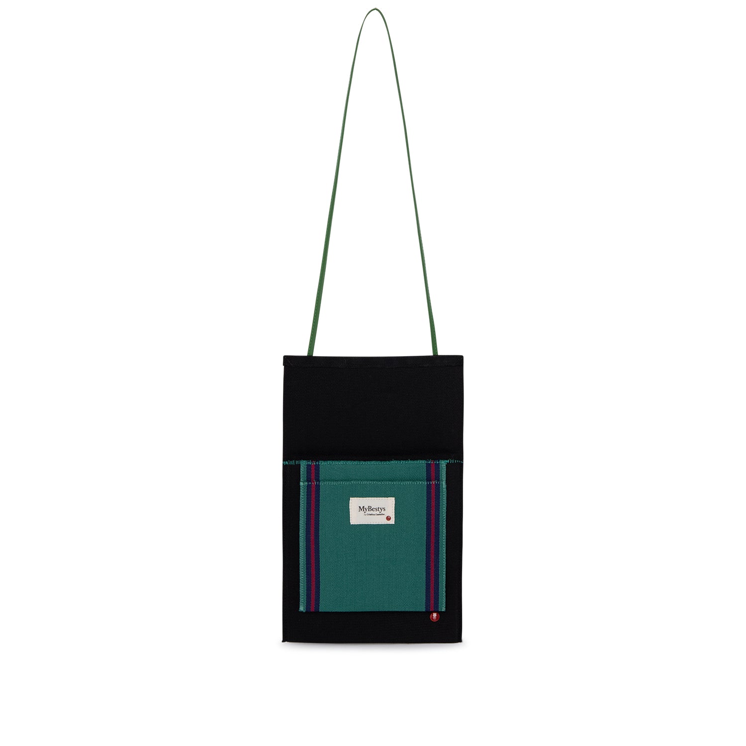 Bandolera loneta Castañer negra, con bolsillo exterior color verde.