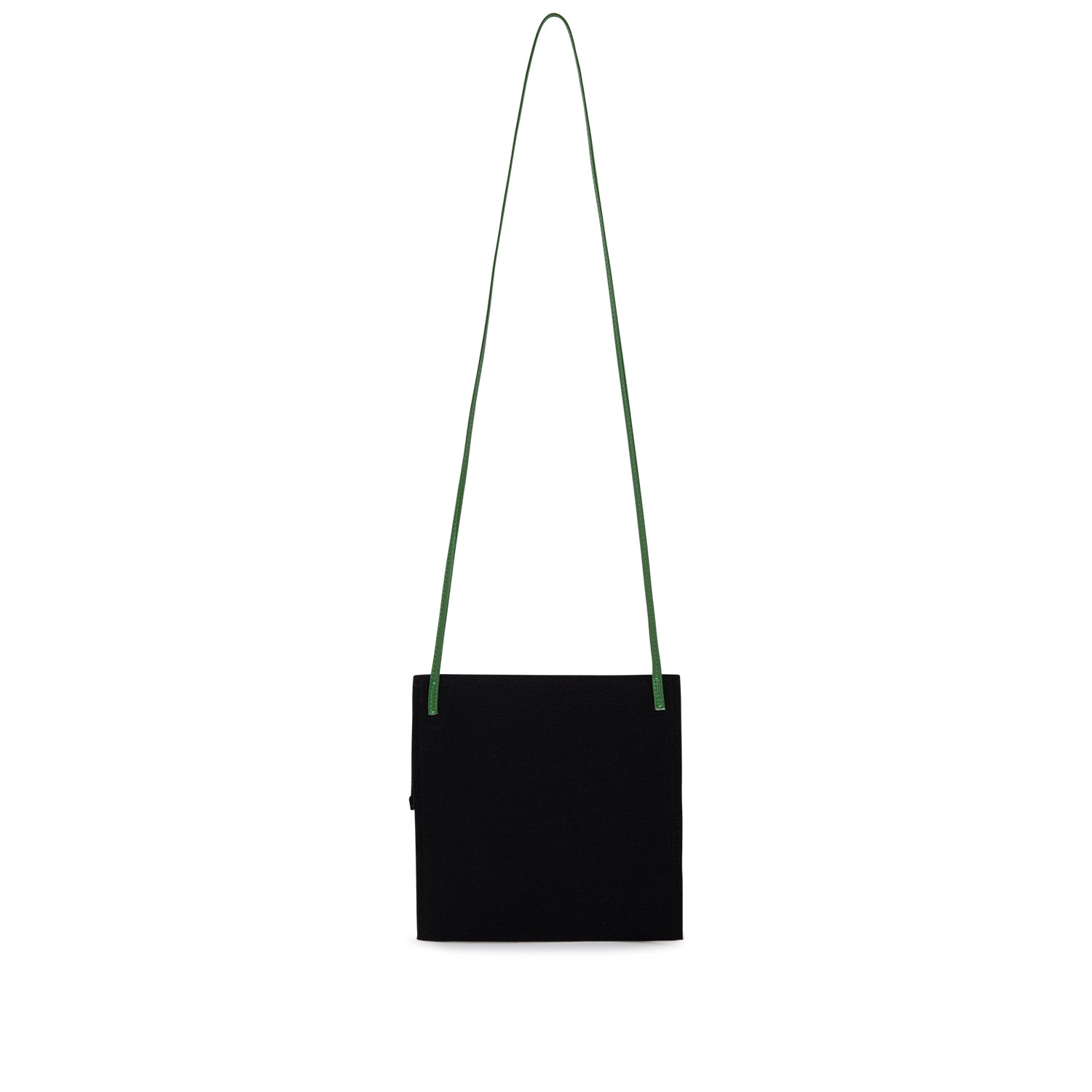 Black canvas Castañer shoulder bag, with green outside pocket. The bag has a green leather handle.